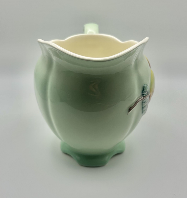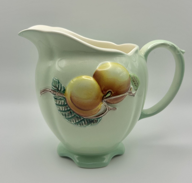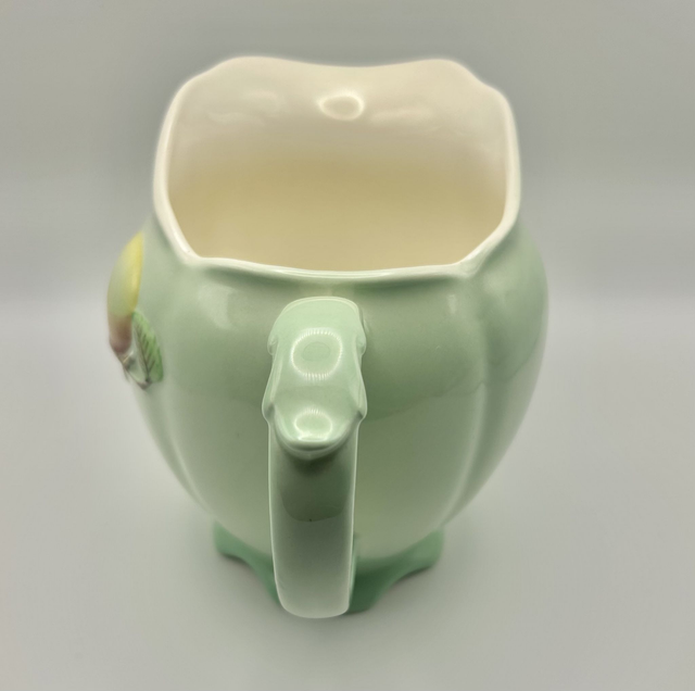 A beautiful 1950s Royal Winton Grimwades jug in a soft mint green glaze with a raised peach and leaf motif. This pastel piece captures the charm of mid‑century English ceramics, with its scalloped base, curved handle, and hand‑finished relief detailing. The interior is clean and cream‑coloured, and the glaze has the gentle sheen typical of Royal Winton’s mid‑century production. Measures approximately Height 12cm, Length 17cm, Width 10cm. Backstamped Royal Winton Grimwades Made In England A, confirming authenticity. A lovely addition to a curated pastel collection, perfect for styling shelves, dressers, or vintage kitchen displays.